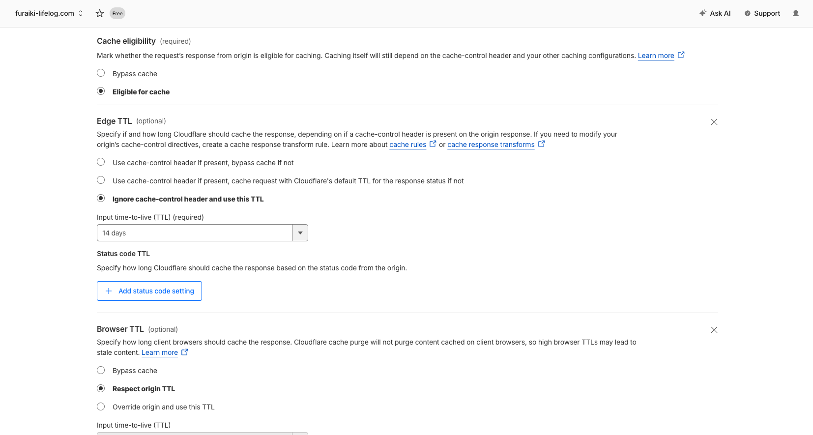 | Browser TTL | Respect origin TTL (Cache-Control: max-age=86400 준수) |